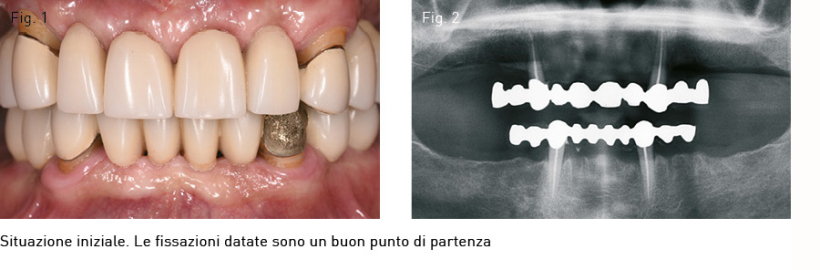 Il sig. Luigi, paziente di vecchia data, portava da circa venti anni una fissazione in oro resina supportata dai soli canini che ormai dondolavano e aveva l’esigenza, per motivi professionali, di non rimanere senza denti. I piani di trattamento ideali o, se volete, “tradizionali” per riabilitare correttamente la situazione si scontravano con le attese appena descritte. L’esecuzione di una protesizzazione bimascellare si avvale dell’uso di mascherine ricavate da set up diagnostici che portano a una previsione attendibile della finalizzazione e sono le guide per i passaggi di registrazione e sviluppo protesico.