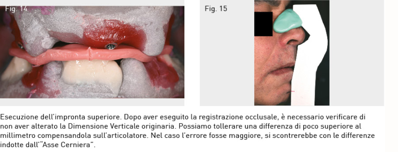 La rilevazione dell’impronta avviene con la stessa tecnica dell’inferiore. In questa fase è fondamentale non influire sulla Dimensione Verticale che al controllo con la dima, compreso lo spessore della cera di masticazione è ancora corretta.