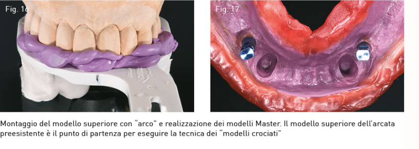 In laboratorio si esegue la procedura dei modelli crociati, si monta in articolatore il modello superiore delle vecchie fissazioni con l’arco facciale, e successivamente si monta il modello master inferiore e il master superiore conseguente al master inferiore. La base di partenza per ogni passo successivo è il primo modello a cui sulle informazioni dell’arco, le immagini e le indicazioni, prese in fase di registrazione si applicano le correzioni del piano occlusale, delle linee verticali e orizzontali, direttamente sul gesso e con cera da modellazione.