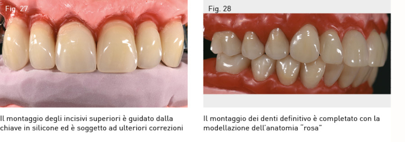 Queste strutture trovano il loro vantaggio nella velocità di esecuzione senza rinunciare alle caratteristiche di rigidità e passività adatte a sostenere una protesi ad ancoraggio implantare. Si fissano molto velocemente delle spine in titanio poste alla base dei denti in modo di creare supporti per evitare le fratture della resina. Dopo una leggera rifinitura siamo pronti a riportare la mascherina siliconica come guida per l’impostazione del montaggio degli incisivi superiori e di conseguenza si esegue tutto il montaggio con i soliti criteri. La ceratura finale presuppone un’anatomia corretta che in gran parte è guidata dalla preparazione della mascherina gengivale opportunamente scavata con maggior profondità negli alveoli dei canini che saranno estratti.