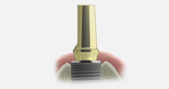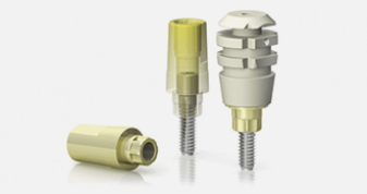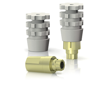 Questi pilastri sono prodotti in titanio di Gr. 5, anodizzati giallo – oro e presentano la stessa geometria esterna del mounter, da cui si differenziano solo per la porzione che entra in connessione con l’impianto: questo pilastro si connette all’impianto attraverso l’ ottagono protesico, guidato dal consueto cilindro guida. La cappetta è la medesima che si utilizza sul mounter, permettendo così di realizzare sia la protesi provvisoria che quella definitiva con la stessa precisione.